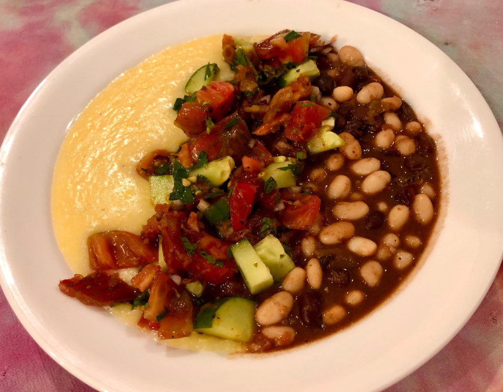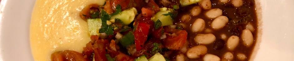 Easy dinner with polenta, beans, and a homemade salsa. John made his regular recipe of 1/2 cup of polenta and three cups of water. He added some cheese near the end of cooking. The beans were both white and black with seasoning of chipotle powder. The black beans came in a South American sauce. The white beans were drained and rinsed. The salsa was a combination of tomatoes, cucumber, onions, jalapeño, and parsley. It was seasoned with salt, cumin, and hot sauce.