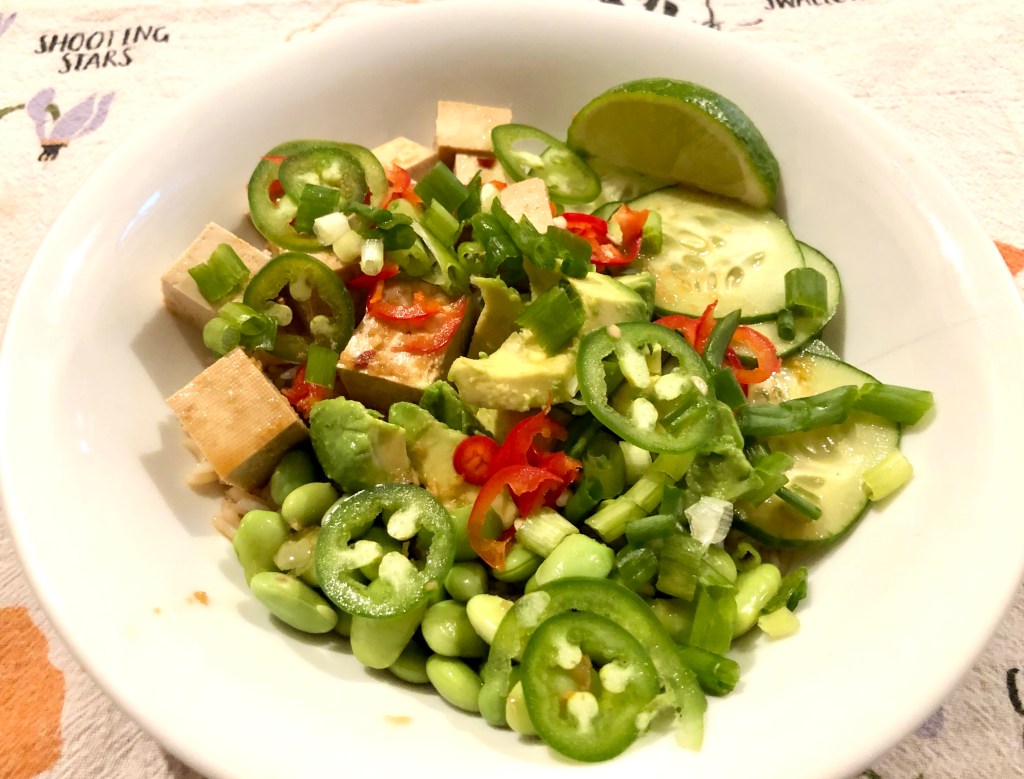 The bowls we make whether they feature tofu, shrimp, or salmon all feature the same vegetables, dressing, and rice. The vegetables are edamame, cucumber, cabbage, peppers, and green onions. The dressing is a soy vinaigrette. We chose a fairly spicy jalapeño pepper and a really spicy red cayenne which was mismarked as a Fresno pepper. It was too hot for me and I had to take them off. Otherwise a good vegetarian/vegan dinner.