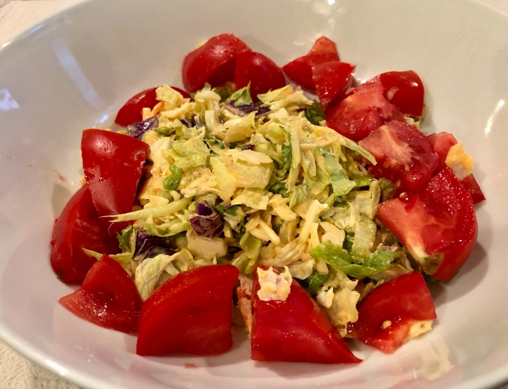 We ate our dinner tonight like it was two separate course. First came the salad course which featured an Asiago dressing and tomatoes from our daughter’s garden plot.