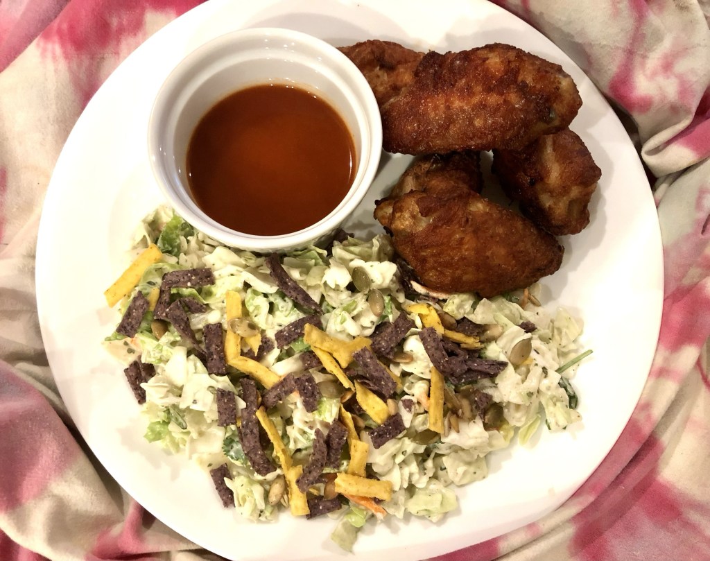 These chicken wings are quite good, gluten-free, come with a spicy sauce, and cook in the oven in about 25 minutes. I also made a southwest salad to go with the wings.