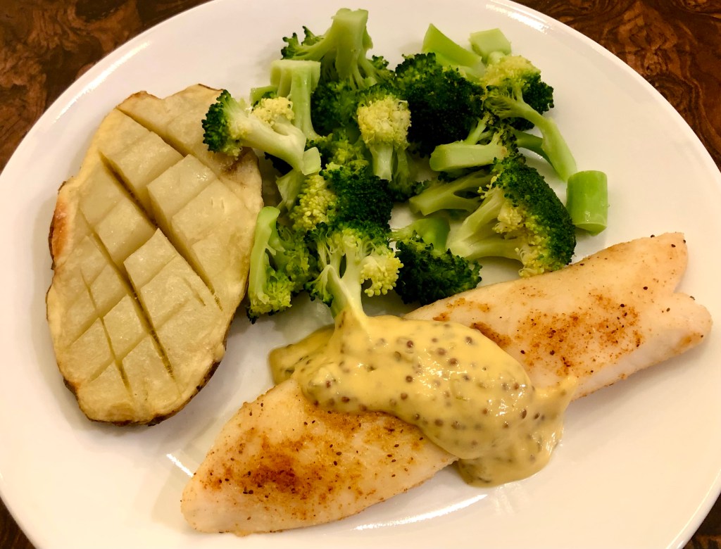 Another easy fish dish, it is amazing how quickly you can cook fish. The tilapia took 8 minutes in a 400F. After microwaving the potato until done, we popped it in the oven to pick up some browning. The fish was done so quickly that the potato did not get much browning. The mustard sauce was a great topping for the fish and potato and a little butter on the broccoli rounded out the dish.