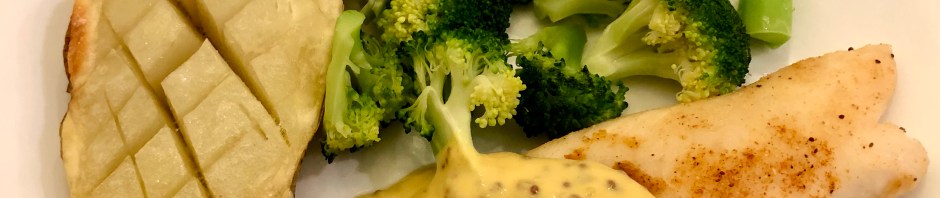 Another easy fish dish, it is amazing how quickly you can cook fish. The tilapia took 8 minutes in a 400F. After microwaving the potato until done, we popped it in the oven to pick up some browning. The fish was done so quickly that the potato did not get much browning. The mustard sauce was a great topping for the fish and potato and a little butter on the broccoli rounded out the dish.