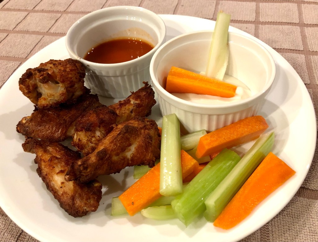 The chicken wings were cooked from frozen on a sheet pan for 22 minutes at 425 F and then for 5 minutes more at 450 F. They came out nice and crispy. We dipped them in hot sauce and blue cheese dressing.
