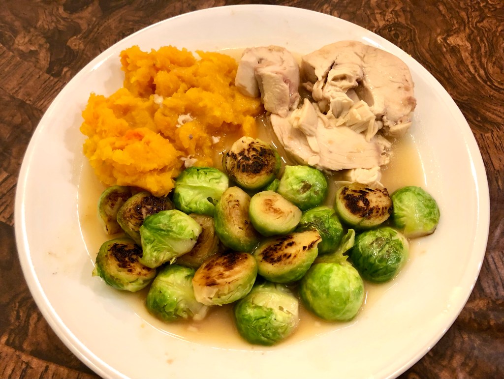 This dinner looks and eats like a pared down Thanksgiving dinner. The chicken is one of the sliced up breasts from Monday’s Costco rotisserie chicken. John made up a packet of chicken gravy and added some of the chicken jus for a better taste. Shortly before dinner he added the chicken slices to gravy until they were warmed through.