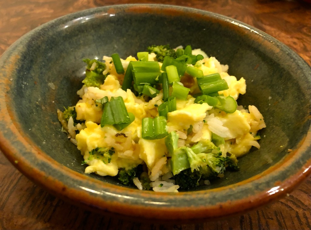 I added a little soy sauce to the rice so it would not taste sweet and also added some broccoli florets and green onions. Heating up the rice in the microwave was enough to cook the florets and green onions. Then I scrambled two eggs to a soft curd and put them on top of the rice and broccoli. A garnish of green onions completed my BFD.