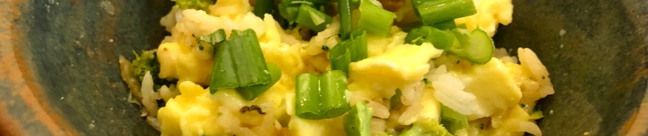 I added a little soy sauce to the rice so it would not taste sweet and also added some broccoli florets and green onions. Heating up the rice in the microwave was enough to cook the florets and green onions. Then I scrambled two eggs to a soft curd and put them on top of the rice and broccoli. A garnish of green onions completed my BFD.
