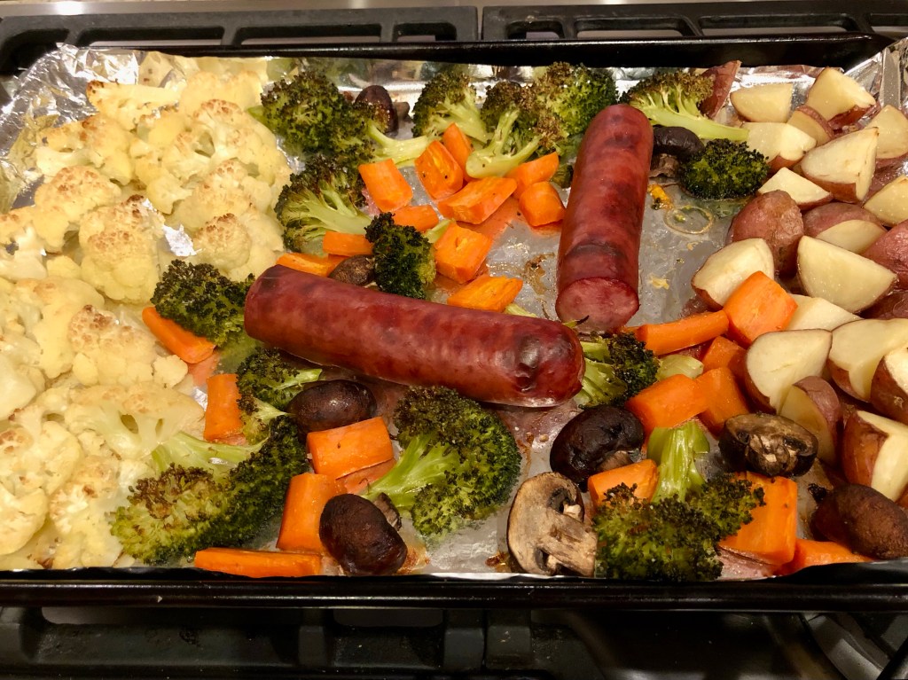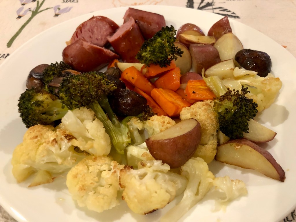Cooking an all-in-one dinner is a bonus for the cook, the diners, and the clean-up crew. Here is a picture of my sheet pan as it came out of the oven.