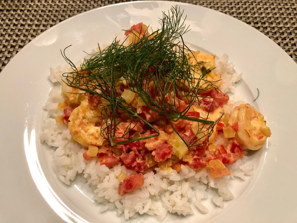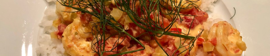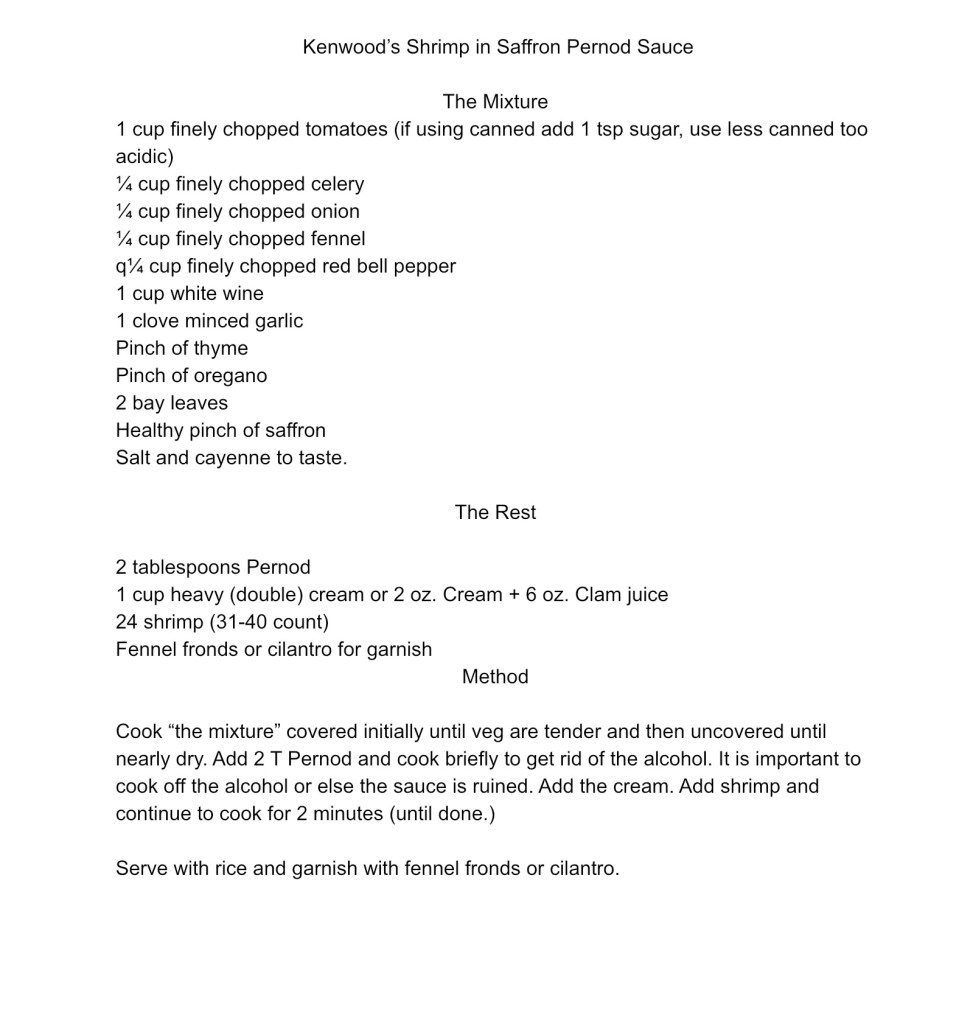 The eponymous Kenwood shrimp from the now defunct Kenwood Restaurant is my company shrimp preparation. Once you have everything chopped up and all the components assembled it takes less than a half hour to make.