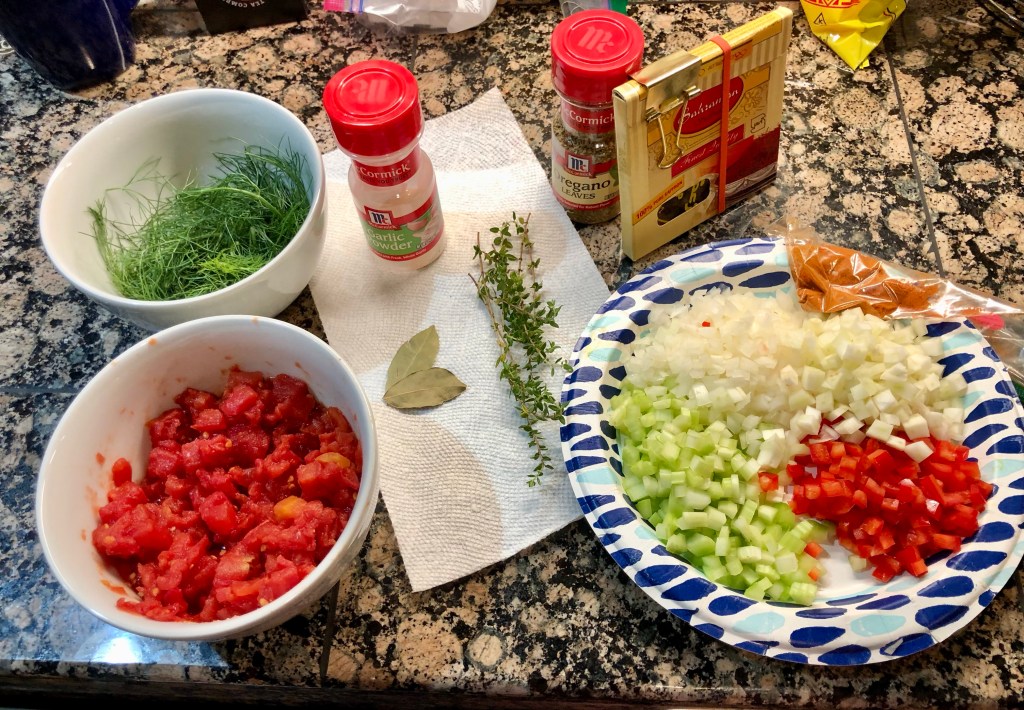 Luckily I like to chop up vegetables. I also like to play around with recipes. Mostly I follow along diligently but today I doubled the pinch of cayenne pepper because my guys like things spicy and after I had served the dish John went back to the portion of sauce left in the pan and added a half cup of clam juice so we could all have more sauce. (So 1 cup cream and 1/2 cup clam juice for more sauce.)