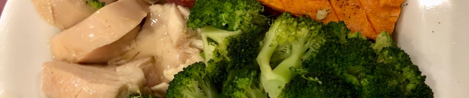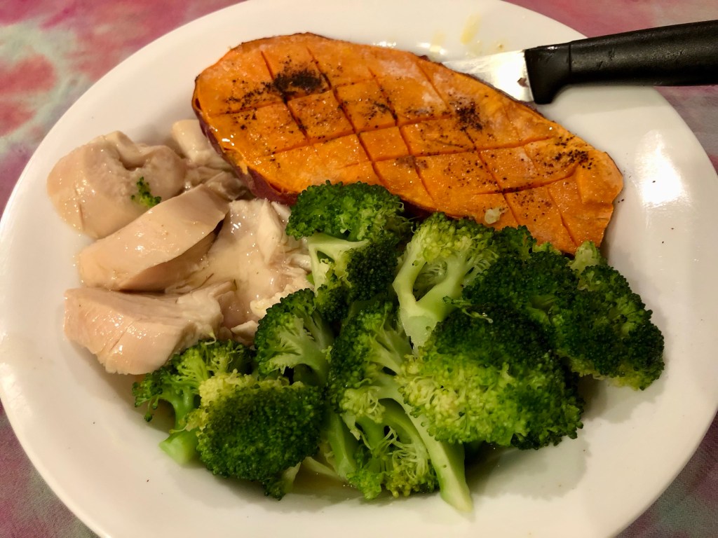 I cooked the buttered and salted sweet potato in the microwave for 8 minutes. The broccoli was steamed.