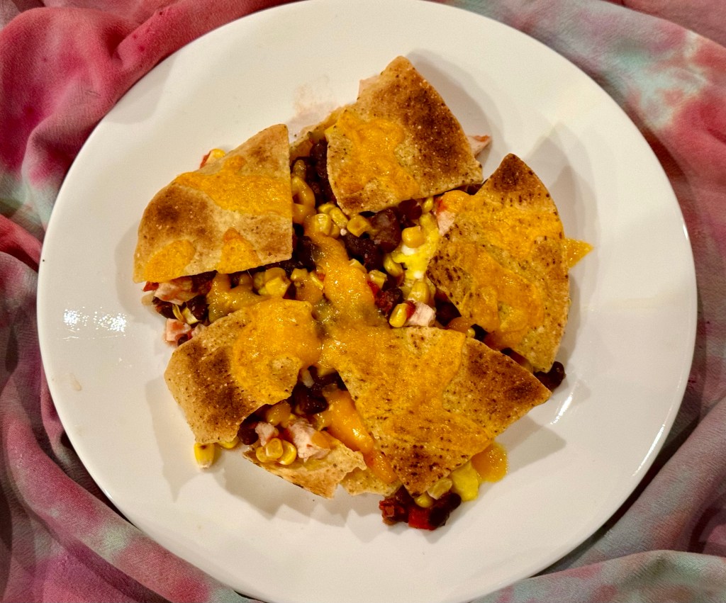 Scrambled egg nachos are a fun treat to eat. After heating the beans and corn, I scrambled the egg and set it side. First I put down a layer of chips. Then I added a layer of corn and beans followed by some salsa. Next a layer of the scrambled egg and pre-cooked chicken. Finally a round of nacho chips and cheese. I cooked the whole thing under the broiler for a couple of minutes until everything was hot and the cheese had melted. Dinner as a snack, Yum!