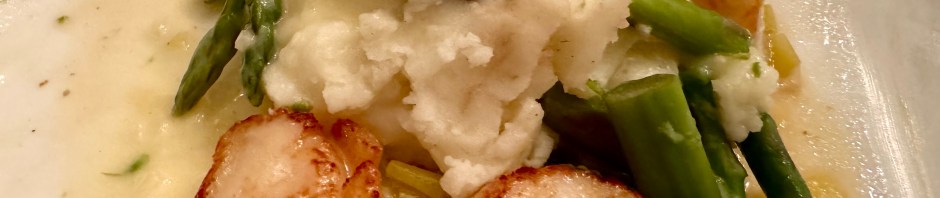 Friday it was my birthday so we made a special meal. We tried to duplicate our son’s fancy meal which we last had a couple of weeks ago when we were in Utah. It is a delicious combination of leeks, potatoes, asparagus, mushrooms, and scallops in a beurre blanc sauce. Wow, does it take a lot of pots and pans to make! But it came out so delicious that I had half eaten it before I remembered to take a picture.