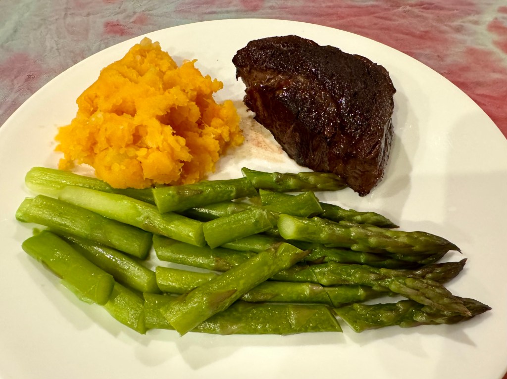 Originally we were planning on grilling the beef and potato but the weather did not cooperate. John did a great job cooking the meat indoors although it was messier than using the grill. For my part I used up some previously peeled butternut squash chunks combined with two small russet potatoes. I microwaved the combo for 11 minutes and then mashed it up with a little butter.