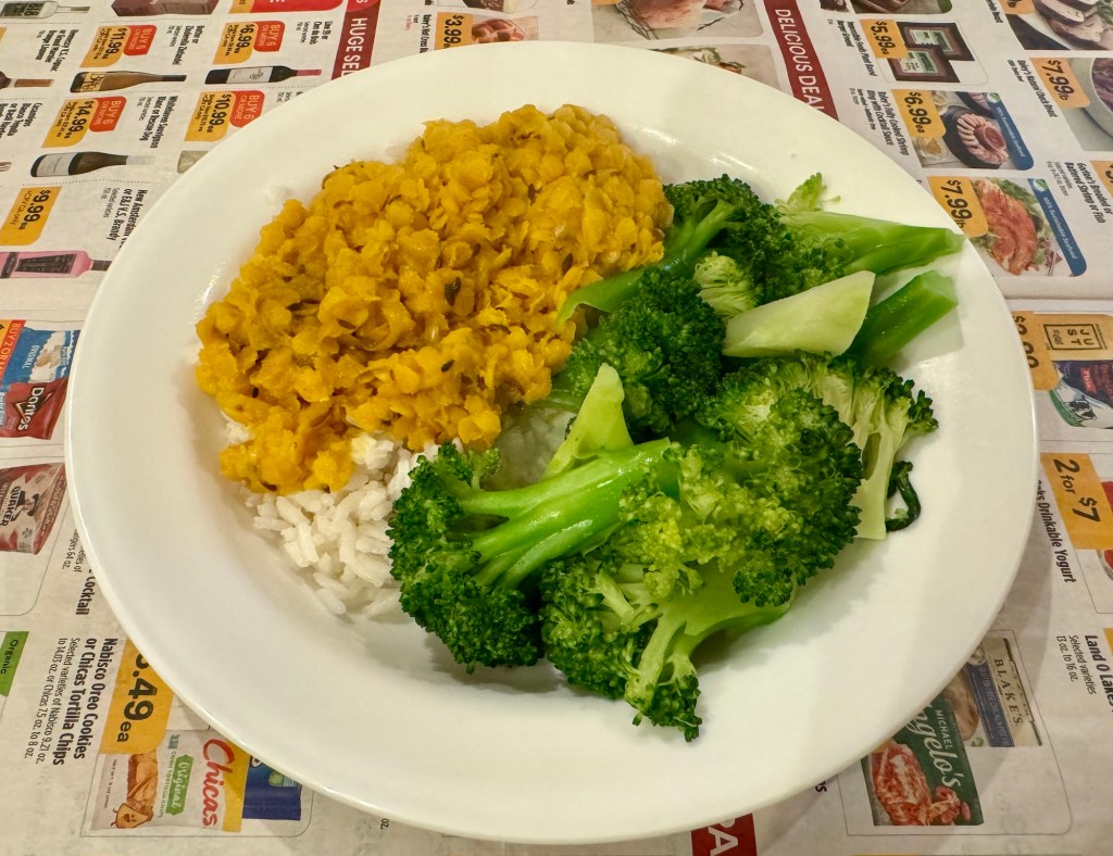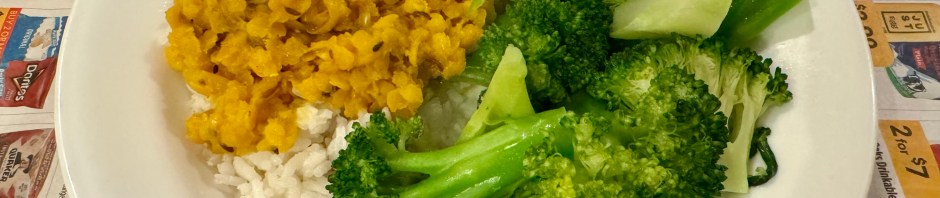 Red lentils are quicker cooking than their brown/green counterparts and the dish is ready to go with 15 minutes of cooking. Red lentils are coral colored in the bag but turn yellow when you cook them. I suppose “Coral-colored lentils that cook up yellow” took up too much labeling space.
