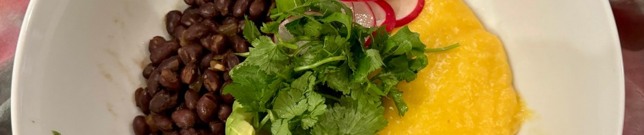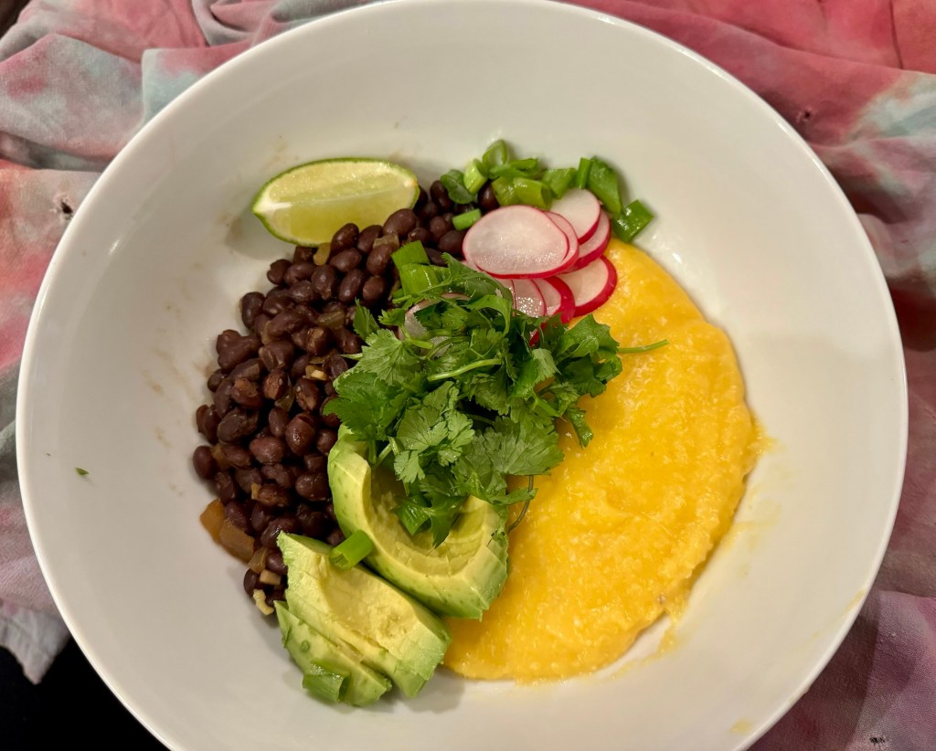 - Spoon the polenta into two bowls and then add the beans along side or on top of the polenta. Add avocado, radish and scallion. Garnish with lime wedges and cilantro.