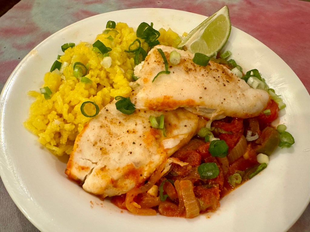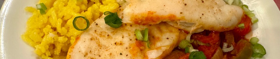 I was looking for a new preparation for tilapia and John suggested trying a Veracruz style dish. Veracruz style dishes use a combination of indigenous and Spanish ingredients. The sauce that the fish cooks in is a combination of tomatoes, hot and mild peppers, olives, and capers. You can find the recipe similar to my dish at