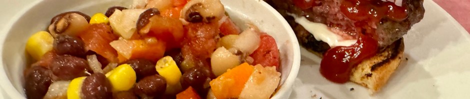 I made a fast version of my Texas caviar. This means that instead of tediously cutting up fresh tomatoes and jalapeños I merely use a can of Rotel. To that I add chopped up onions, carrots, bell peppers, and a can each of drained and rinsed black beans and black-eyed peas. Then I dress the vegetables with Italian dressing and add salt and Tabasco sauce to taste.