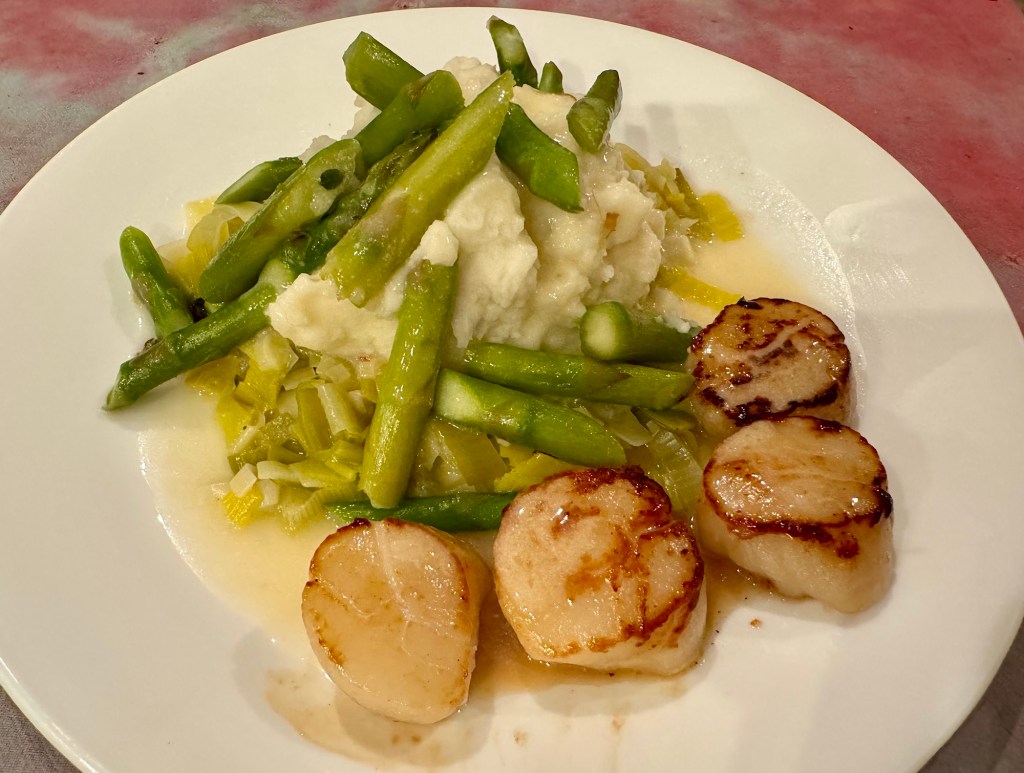 There are a lot of moving parts to our fancy dinner but none of them are especially difficult. John is in charge of cooking the scallops which he does after everything else is ready. They only take a couple of minutes.