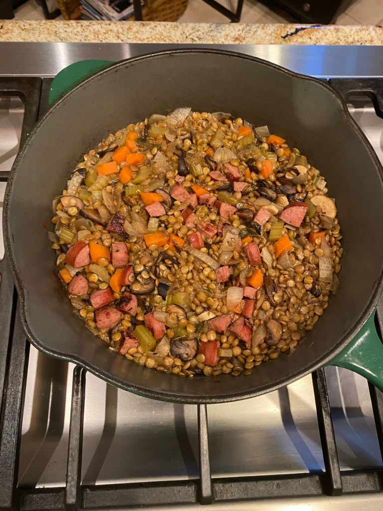 I had no question about whether John could survive for almost two weeks without me there peeling and chopping his vegetables. Lentil stew is one of his favorites and a good dish to clean out the fridge of growing-old vegetables. Looks like he put mushrooms and celery in the pot as well.