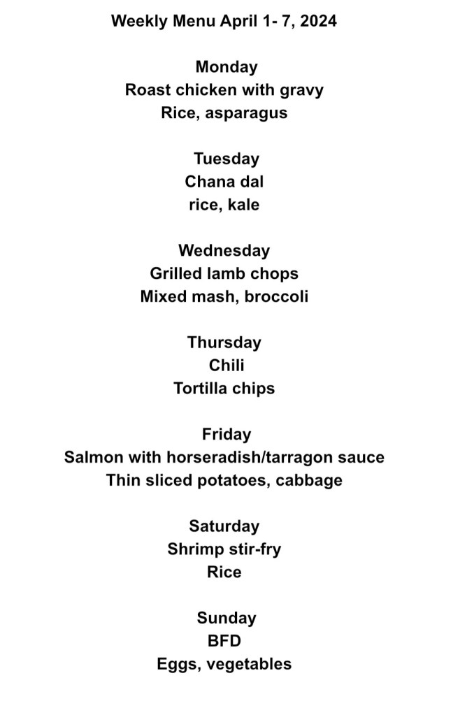 Here is what we are hoping to eat this week! Each week I print out the menu and hang it in the kitchen. Doing this insures that I will have put frozen items in the refrigerator the day before and that I will have the ingredients I need. It also gives our daughter a chance to peruse the menu and check off the dinners she will be opting in for. That way I can plan on which nights I will need to be feeding 3 and not 2.