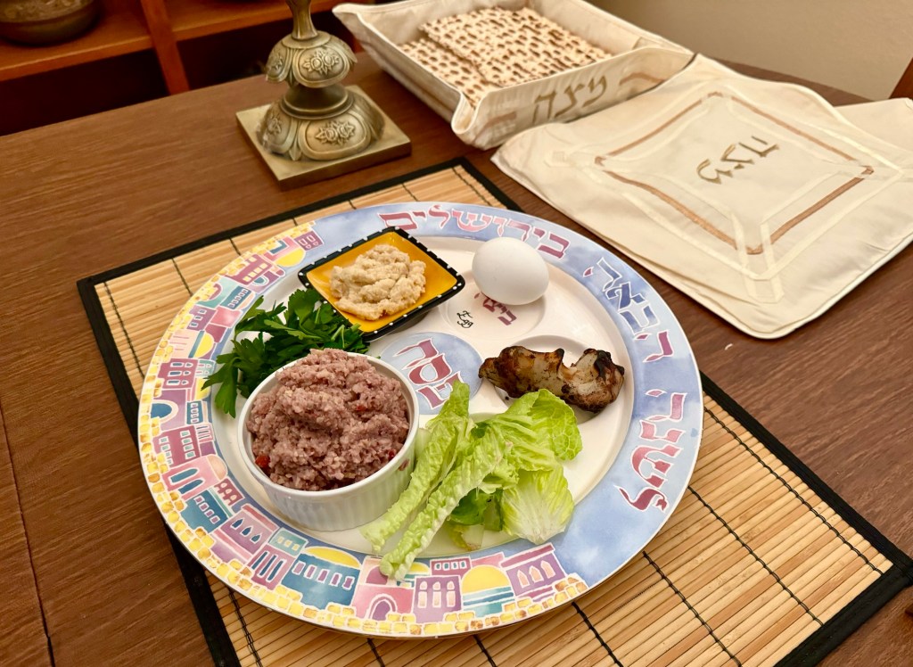 On Monday, April 22, 2024 we celebrated the first night of Passover. Our Seder plate included lettuce, parsley, charoses (apples, walnuts, wine), horseradish, an egg, and a lamb bone.