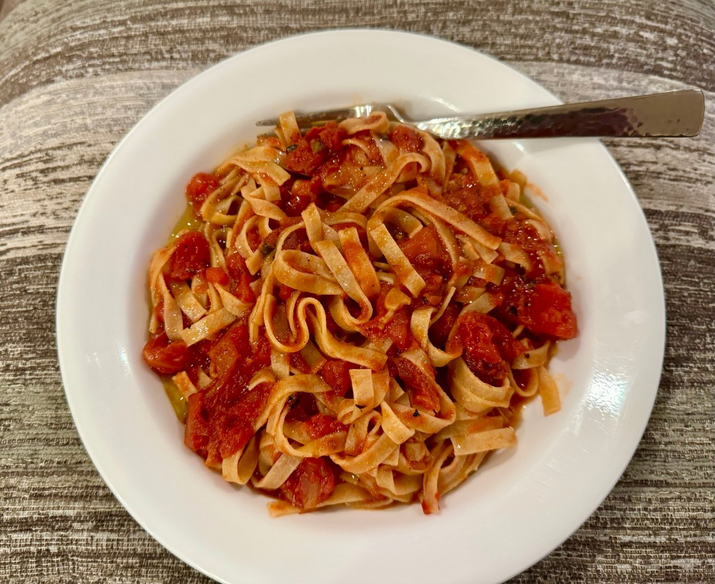 Last week I made some spicy tomato sauce to serve with bucatini. We had some left over sauce so I decided to go the pasta route again on Wednesday. Since there was not enough sauce left for another dinner I added an additional 14 ounce can of petite diced tomatoes and some fresh oregano from the garden. The complexity of the sauce changed from spicy to tart. It was almost like I had created a whole new dinner! I used Carba-nada fettucine which comes in convenient sized strands and cooks quickly. A glug of good olive oil finished my dish.