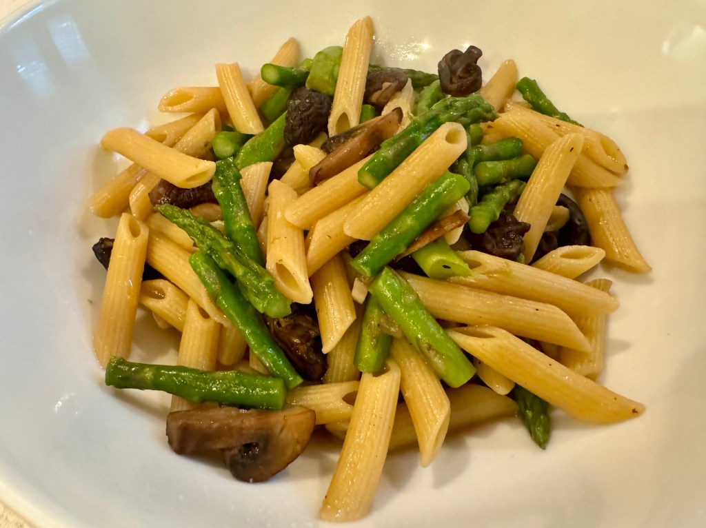 I really like the look of penne and asparagus. The asparagus mimics the shape of the penne. Plus this is super simple and quick to make. While the water is heating up for the pasta is plenty of time to cook the mushrooms with some chopped onions and garlic. In the last couple of minutes that the pasta is cooking it is time to add the asparagus to the mushrooms with a little pasta water. When the penne is al dente drain it and add it to the vegetables with 1/4 cup additional pasta water and a tablespoon of olive oil.