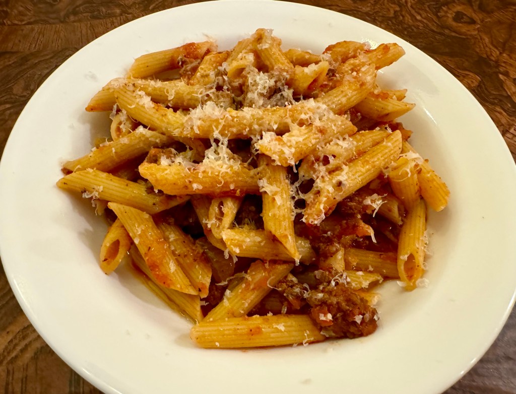 As an aside, since grocery prices have increased, it is important to flex your economic power by stretching your proteins. I took 1 pound of ground beef and used half of it to make 8 stuffed pepper halves which were a dinner and two lunches. The other half pound was used for this spaghetti sauce. Actually if I had added another can of tomatoes I probably could have squeaked out another pasta meal.