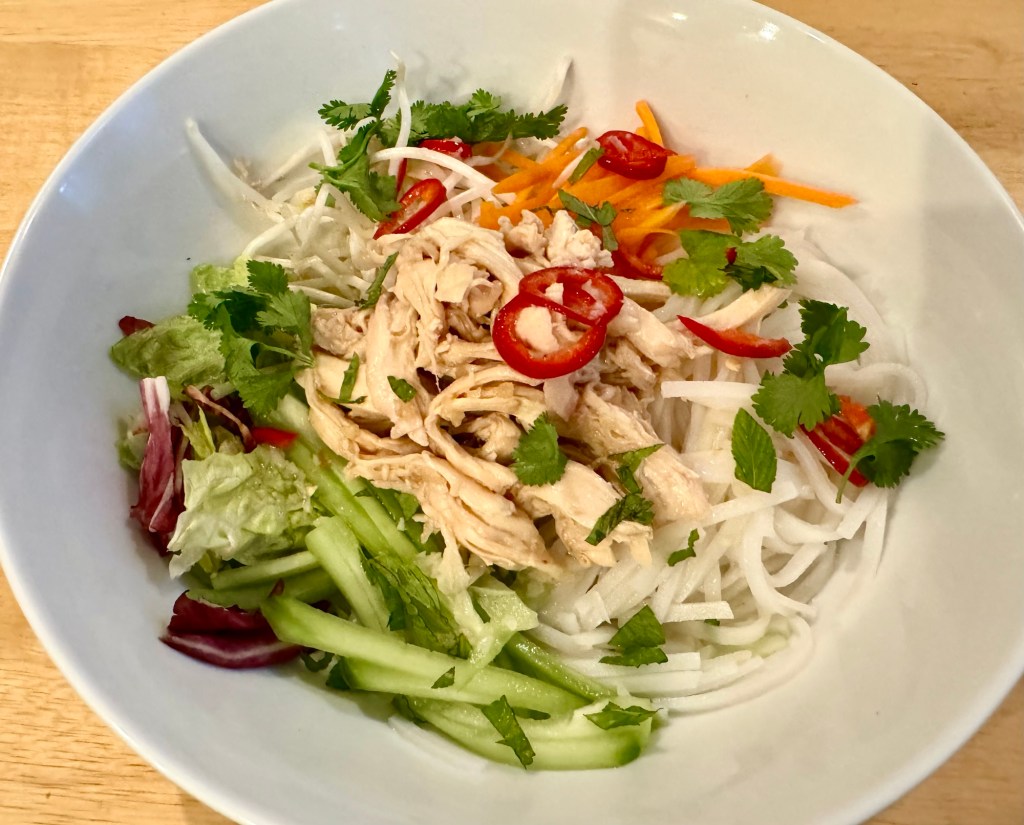 It turned out really well. The recipe calls for cooking the chicken but it is much easier if you use an already cooked one. The rice noodles are boiled in the recipe but I just soaked mine in hot water. It also calls for quite a bit of sugar but I suggest you start with a third of the amount and then add more to get it to your sweetness tolerance.