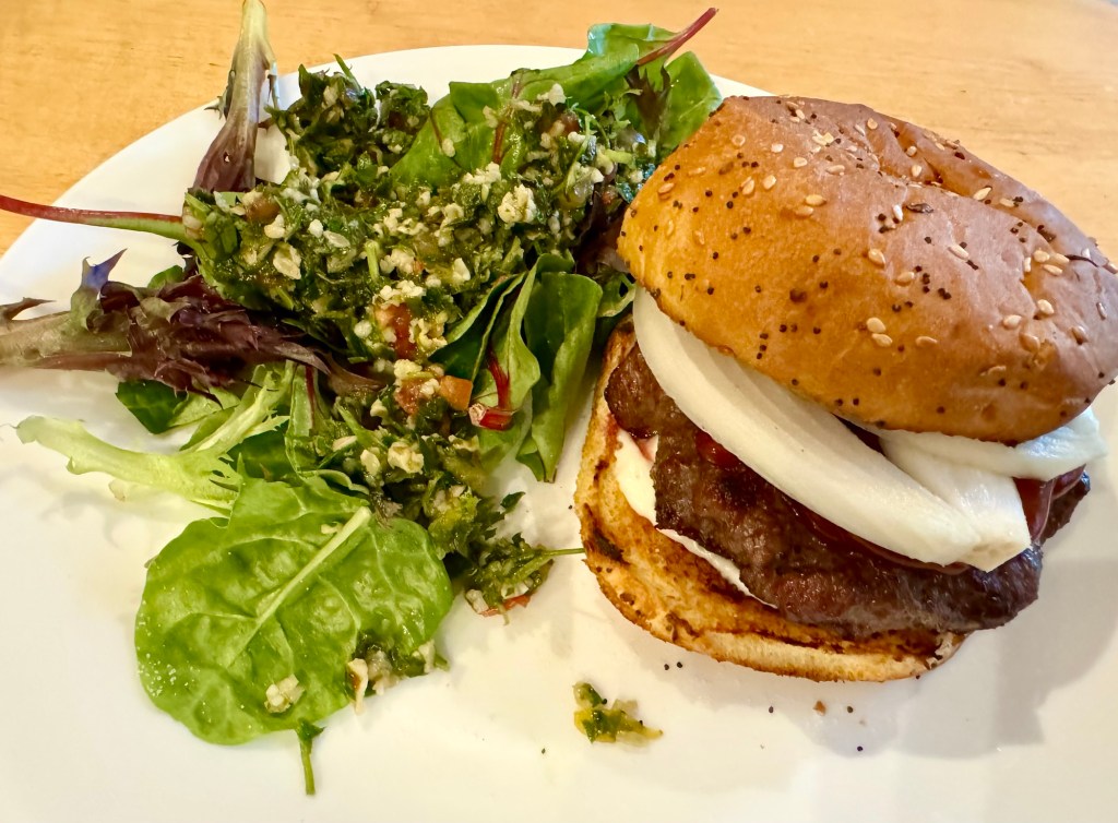 Along with our Mexican starter and an all-American grilled hamburger we are having leftover Middle Eastern parsley salad or tabbouleh. Since there is not enough for a portion for each of us, I am going out to my herb garden and clipping some additional parsley, mint, oregano, plus whizzing up some salad greens. Additional garlic, olive oil, lemon juice, and salt should give us enough.