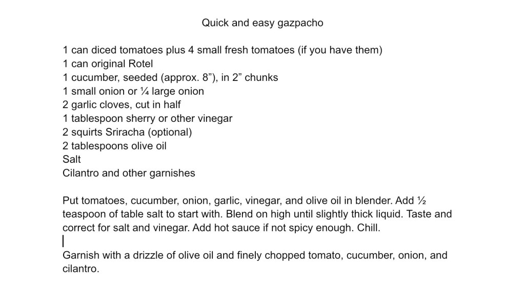 After having this late lunch on a very hot day we were looking forward to a light dinner. I had made gazpacho in the morning and it was hanging out in the refrigerator getting acquainted with its various ingredients. Here’s my easy gazpacho—