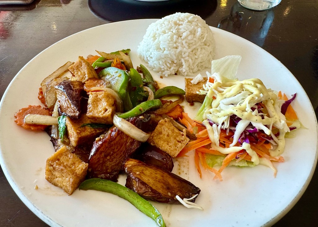 Today we went out in the insufferable hot weather. While out we made three attempts at getting lunch. First place was closed, no explanation. The second had finished its lunch service a few minutes earlier and told us that they were only doing take-out. Finally we collapsed into Bangkok 101 and discovered they made our favorite dish and they were willing to make it for us. The dish is Thai basil eggplant with crispy tofu. Yum! All of our walking around in the heat was worth it!