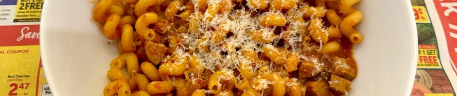 Luckily today was cooler. I defrosted the sauce and cut up the sausages in small chunks. John cooked up a pot of celletani (which is exactly the same as cavatappi) and I warmed up the sauce. It was so delicious and a nice break from all the salad-y dinners we have been having lately!