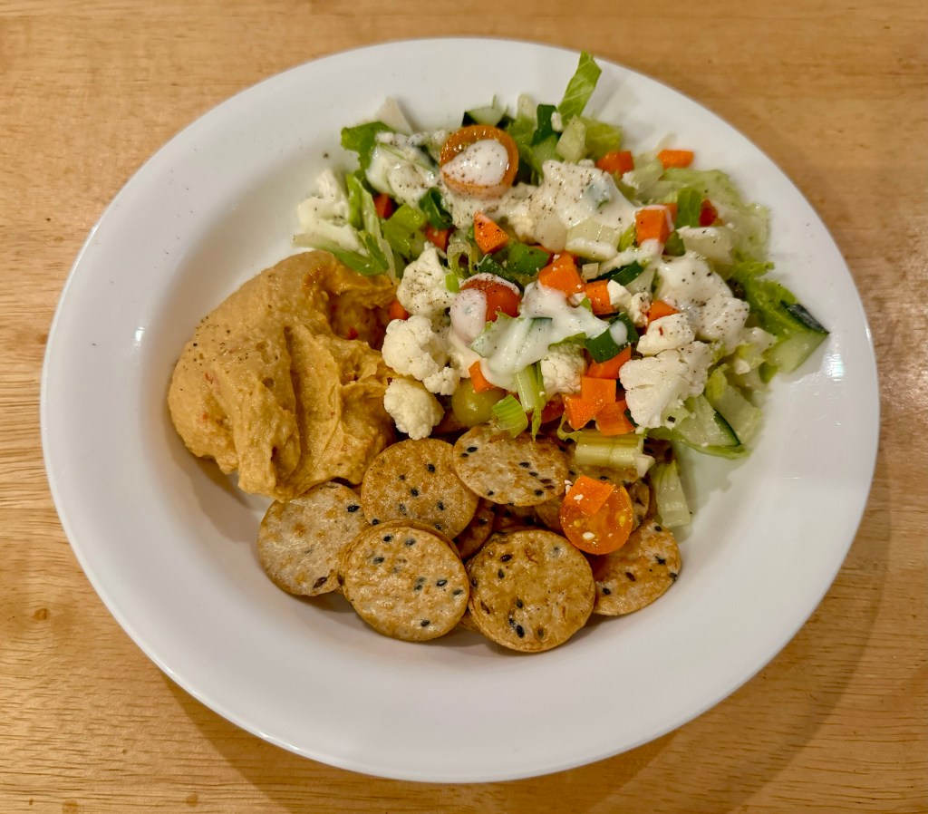 I prepared an easy vegetarian/vegan dinner for a hot evening. The hummus is simply one of Sabra’s varieties and the rice crackers are from Trader Joe’s. They are gluten free. After doing so much nothing as meal prep I decided to fancify my tossed salad by making it a chopped salad. Along with some small pieces of Romaine lettuce I chopped up celery, carrots, tomatoes, cauliflower, feta, scallions, and cucumber. I dressed mine with Bolthouse blue cheese dressing but vinaigrette would work as well.