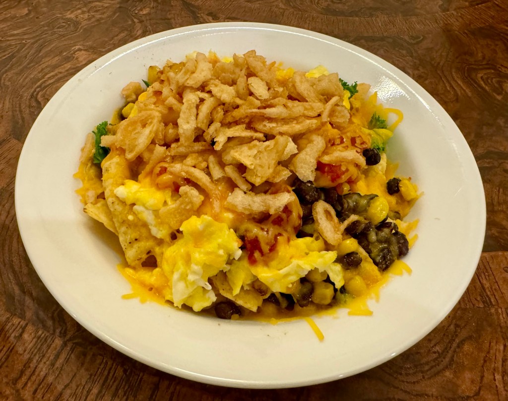I am finally returning to Breakfast for Dinner or BFD on Sundays. Nachos with eggs is one of my favorites. In the bottom of my bowl are tortilla chips then warmed black beans, corn, and kale. This is followed by a scrambled egg and salsa. Next up is shredded cheese and since we were out of green onions I used some fried onion bits. I popped the whole thing in the microwave until the cheese melted, probably about 45 seconds. Voila! An egg dish that was tasty and fun to eat!