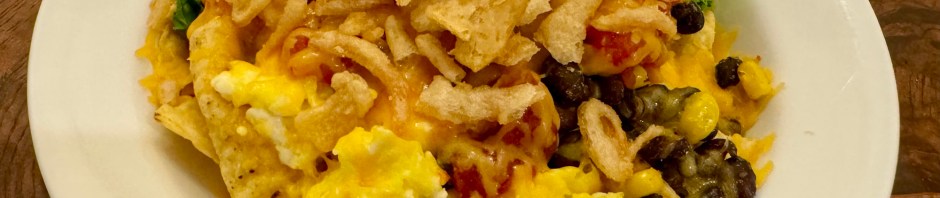 I am finally returning to Breakfast for Dinner or BFD on Sundays. Nachos with eggs is one of my favorites. In the bottom of my bowl are tortilla chips then warmed black beans, corn, and kale. This is followed by a scrambled egg and salsa. Next up is shredded cheese and since we were out of green onions I used some fried onion bits. I popped the whole thing in the microwave until the cheese melted, probably about 45 seconds. Voila! An egg dish that was tasty and fun to eat!