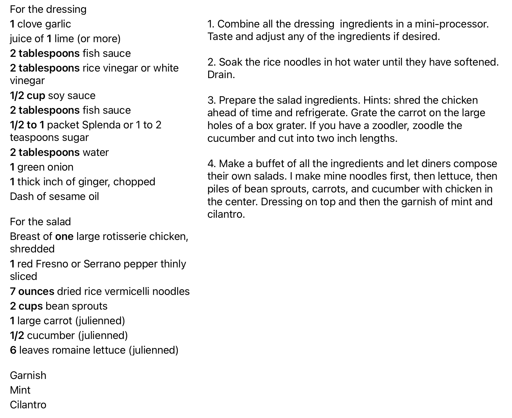 This is a tangy hot weather salad. I adapted it from a much more complicated recipe. Using rotisserie chicken, a mini-prep processor, a box grater, and a zoodler made this dish much easier.