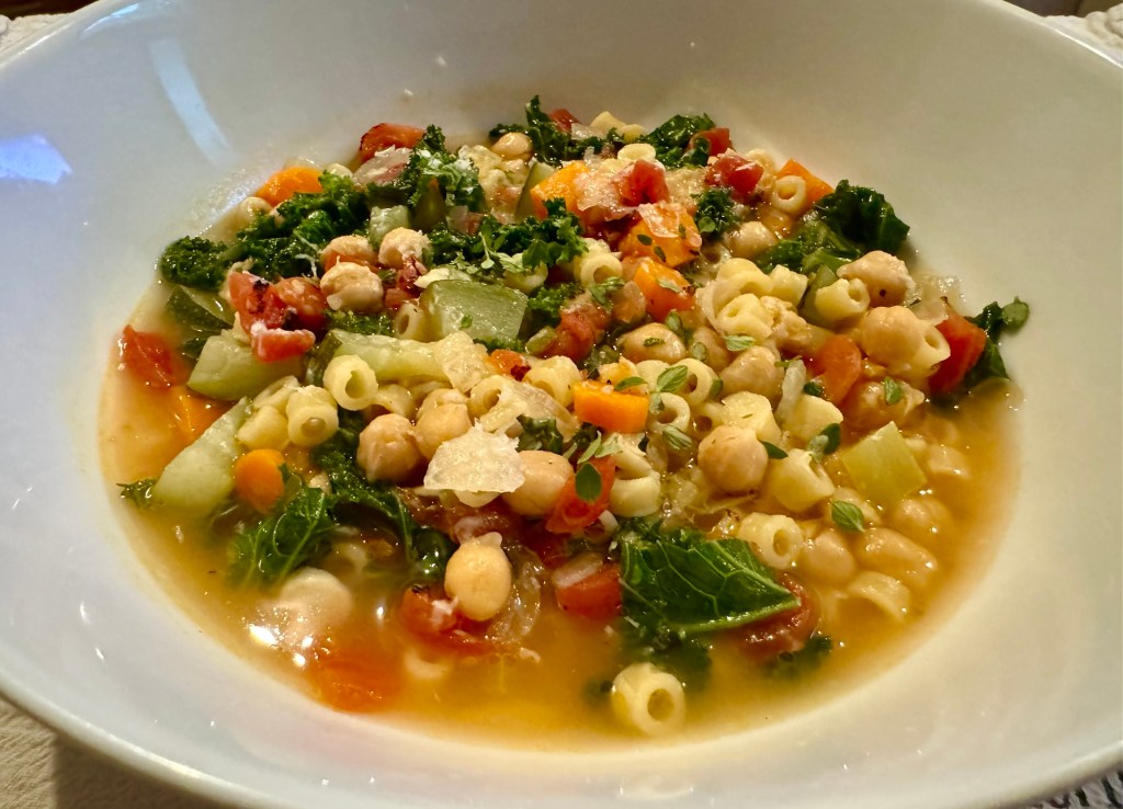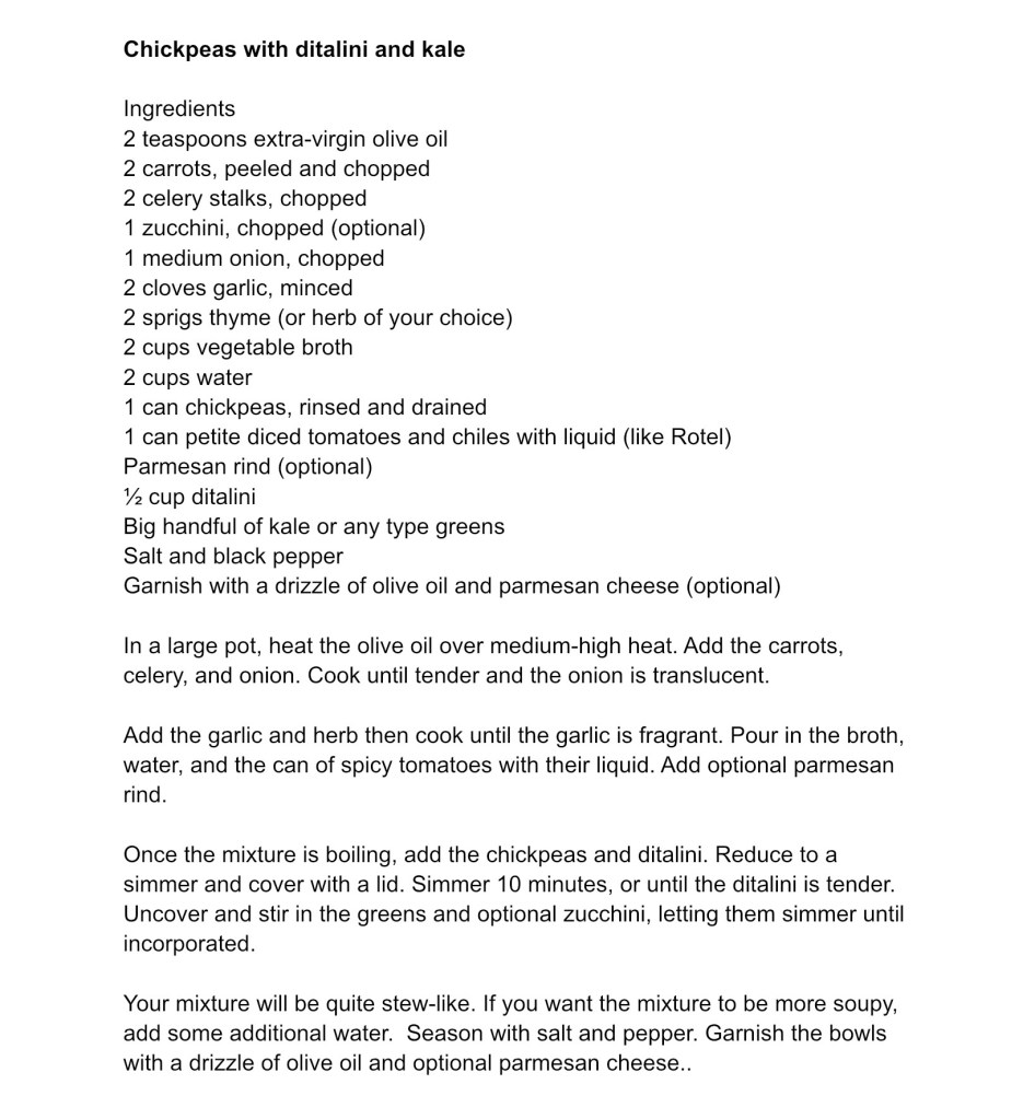 This yummy vegetable and legume creation comes together in about a half an hour if you are a fast chopper. I tend to start the onions cooking while I am chopping up the rest of the veg. Here’s the recipe –