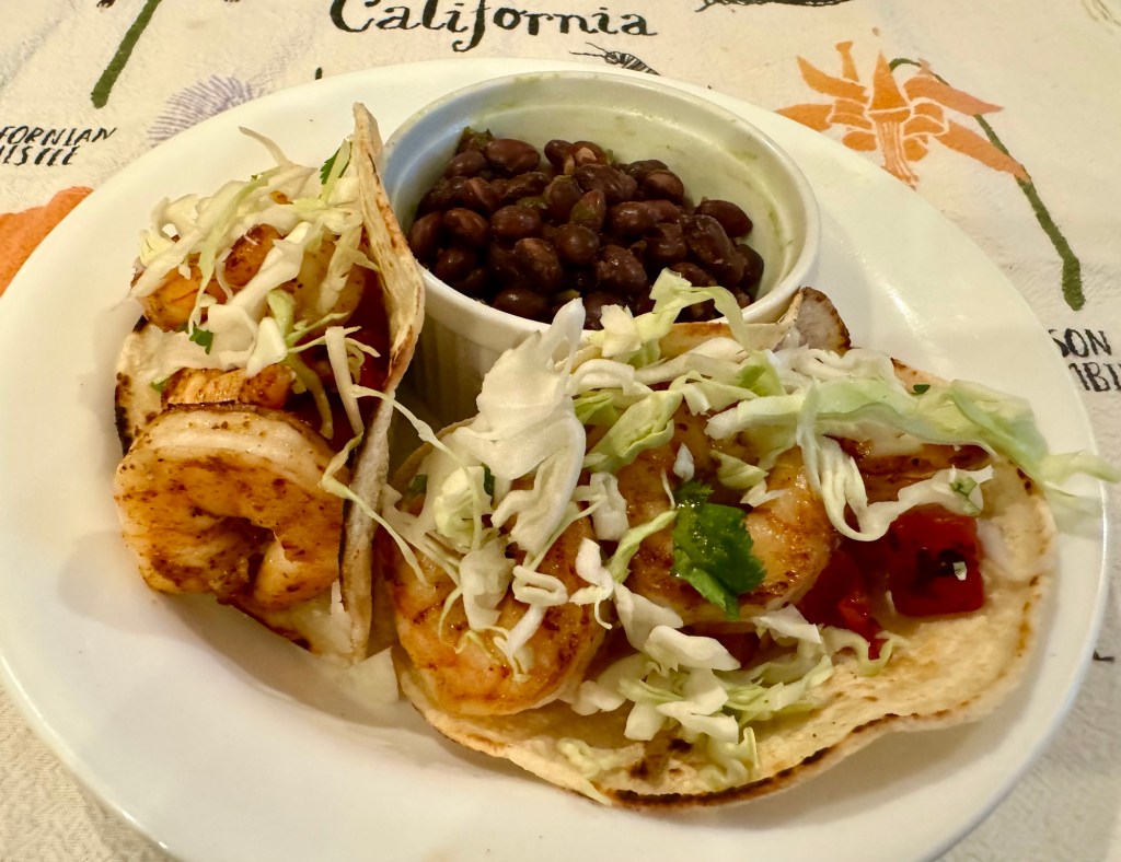 John as usual cooked the shrimp perfectly while simultaneously charring the corn tortillas over an open flame. I made the mango salsa with the spicy tomato part of a can of Rotel and a ripe mango. The spicy black beans were cooked in the juice from the can of Rotel and further spiced up with cumin and chipotle powder.
