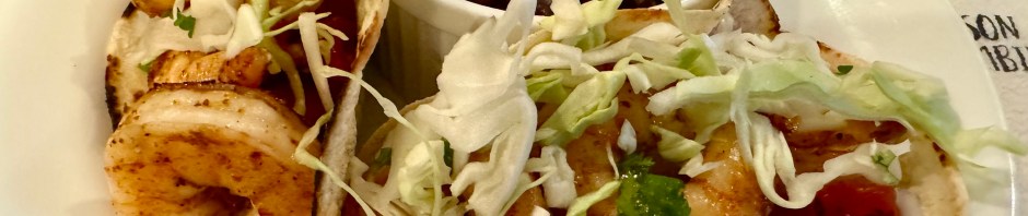 John as usual cooked the shrimp perfectly while simultaneously charring the corn tortillas over an open flame. I made the mango salsa with the spicy tomato part of a can of Rotel and a ripe mango. The spicy black beans were cooked in the juice from the can of Rotel and further spiced up with cumin and chipotle powder.