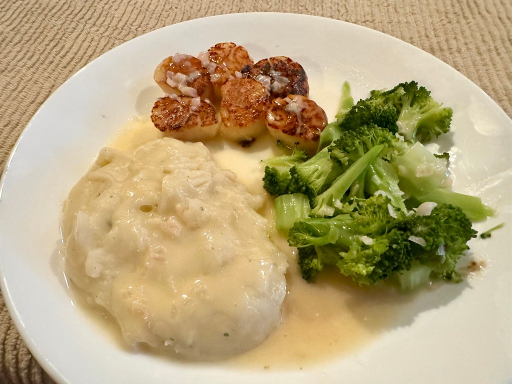 Tuesday’s dinner was supposed to be salmon with a mustard sauce. I ask John to take out a couple of pieces of salmon to defrost. He cannot find it. John is notorious for not being able to find things in the refrigerator and freezer so I am not concerned. I will find the salmon myself I think. No such luck! A quick pivot to sea scallops saves the day!