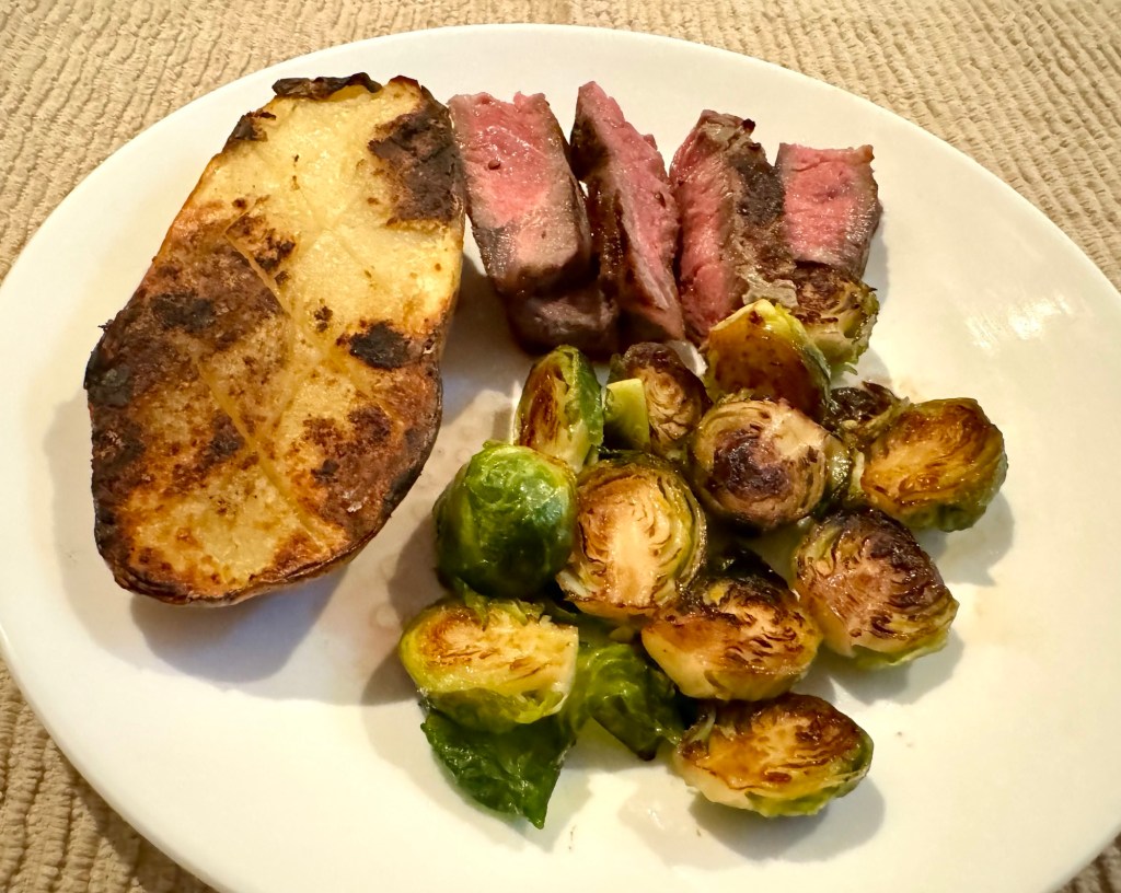 Gosh, we are having tasty meals this week! John grilled the steaks to a perfect medium rare and tended over the potato I had baked earlier so that the surface slightly charred. I made what my family calls IDBS, incredibly delicious Brussels sprouts. The flavor of the sprouts is enhanced with butter, sugar, salt, and dry sherry.