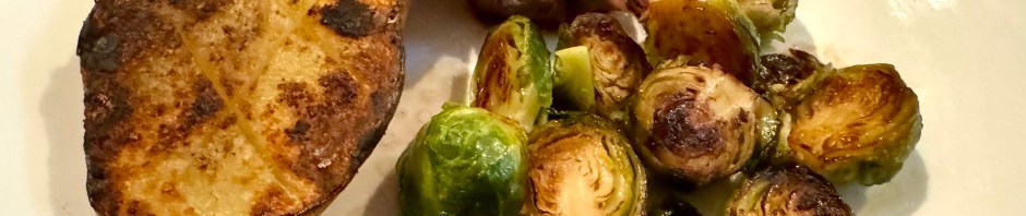 Gosh, we are having tasty meals this week! John grilled the steaks to a perfect medium rare and tended over the potato I had baked earlier so that the surface slightly charred. I made what my family calls IDBS, incredibly delicious Brussels sprouts. The flavor of the sprouts is enhanced with butter, sugar, salt, and dry sherry.