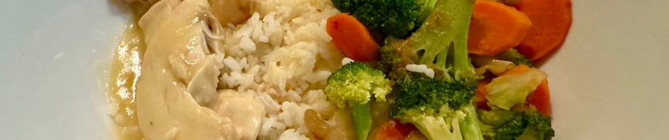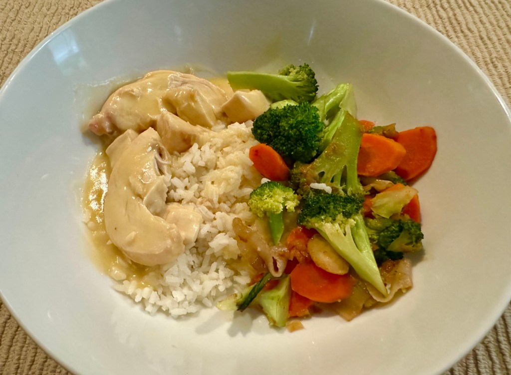 John makes the gravy from a packet and gently warms up the sliced chicken breast. He made the rice yesterday so it only needs warming in the microwave. I am running low on vegetables so I make a combination of broccoli, carrots, and shallot. In less than 30 minutes dinner is ready.