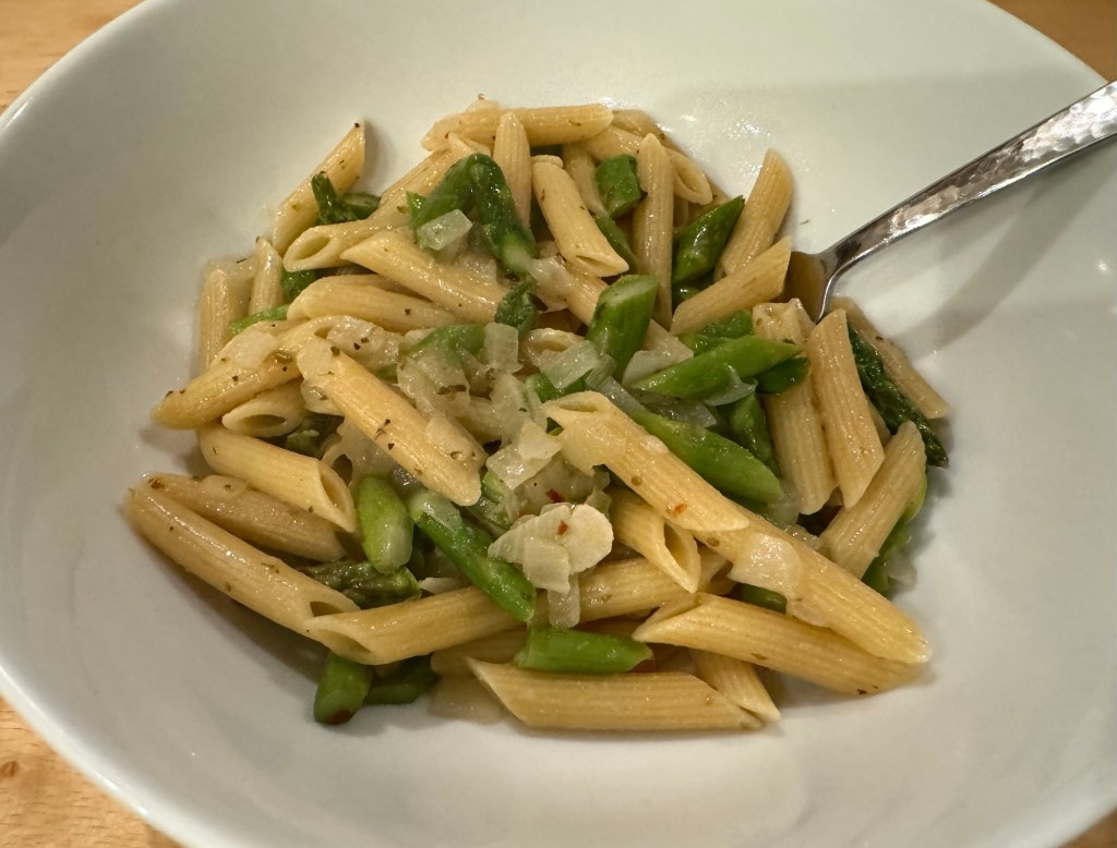 I love the way that the asparagus mimics the shape of the penne in this super easy pasta dish. While the water gets to boiling I prep onion, garlic, and the asparagus. Once the pasta goes in the water to cook for 10 minutes I heat up some olive oil and sauté the onion and garlic. A few minutes before the pasta is done I add the asparagus. Once the pasta is drained it joins the vegetables. I stir them around a bit and add some pasta water to make a light sauce. After serving you might like to garnish it with a drizzle of olive oil and some grated Parmesan cheese.