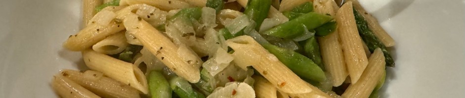I love the way that the asparagus mimics the shape of the penne in this super easy pasta dish. While the water gets to boiling I prep onion, garlic, and the asparagus. Once the pasta goes in the water to cook for 10 minutes I heat up some olive oil and sauté the onion and garlic. A few minutes before the pasta is done I add the asparagus. Once the pasta is drained it joins the vegetables. I stir them around a bit and add some pasta water to make a light sauce. After serving you might like to garnish it with a drizzle of olive oil and some grated Parmesan cheese.