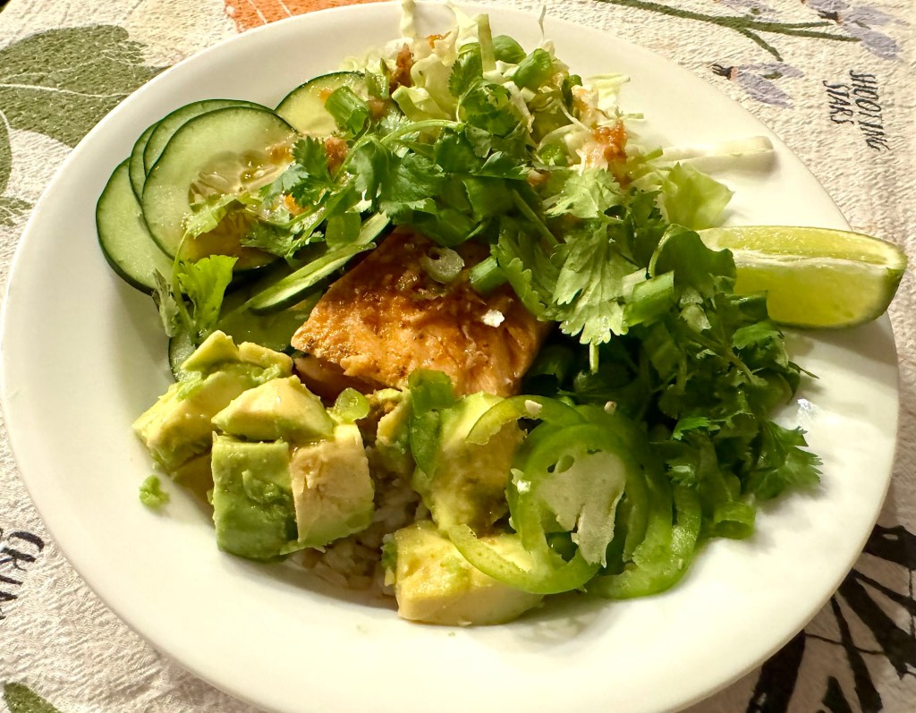 This is the bowl that started our bowl-mania. It consists of a piece of just cooked through salmon on top of rice and nestled among chopped cabbage, avocado, edamame, and cucumber. It is garnished with a soy vinaigrette, sesame oil, cilantro, green onions, jalapeños, furikake, and a squeeze of lime. So good!