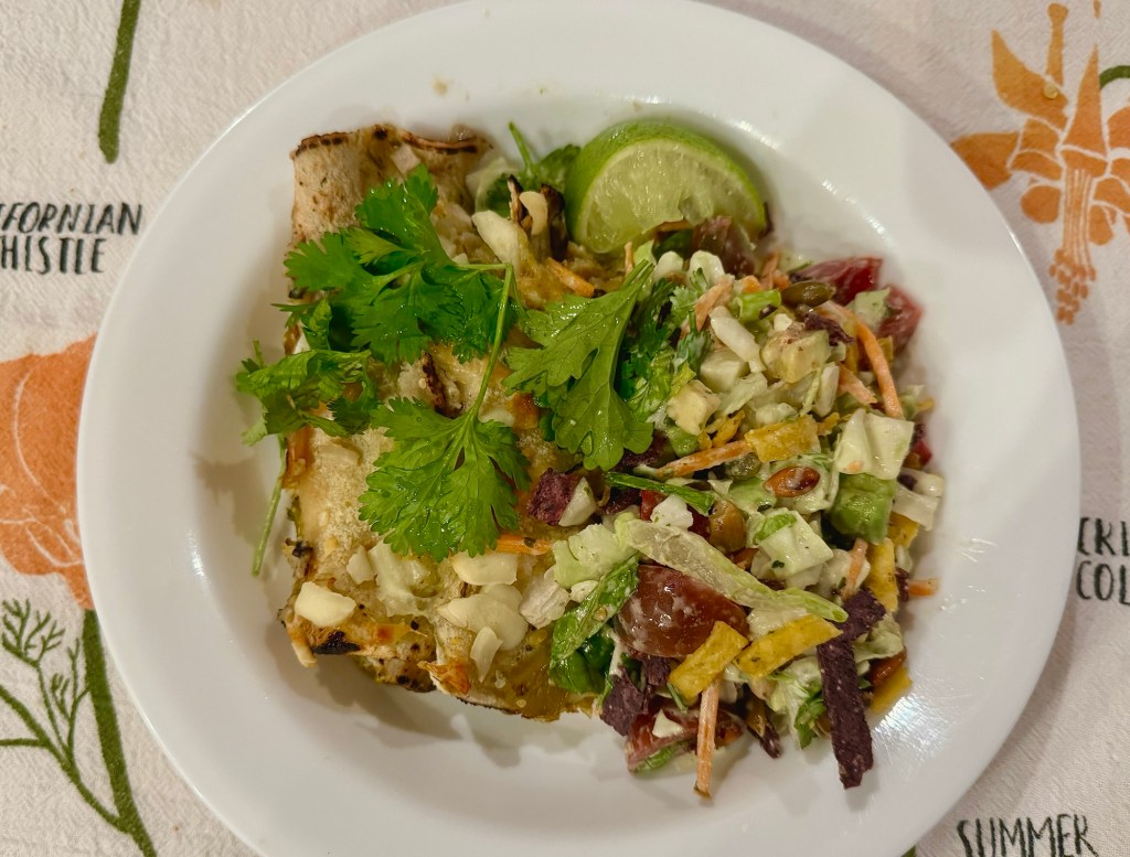 My iPad is running out of power so quickly these are tortillas rolled with shredded chicken from a rotisserie chicken, onions, salsa verde, and shredded cheese. Quickly sear the tortillas and then lay in some sauce, chicken, cheese, and onion. Bake for 35 minutes in a 350F oven as a casserole with additional coating of salsa verde on the top and bottom. Add some cheese on top before baking. Serve with salad. Delicious!