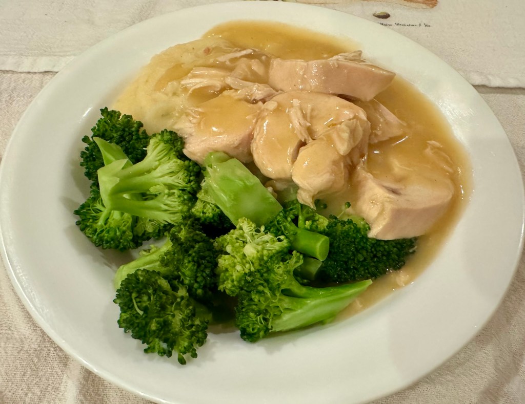 John sliced up the breast and warmed it gently in chicken gravy. I made mashed potatoes and broccoli. It was a quick, easy, and economical dinner!