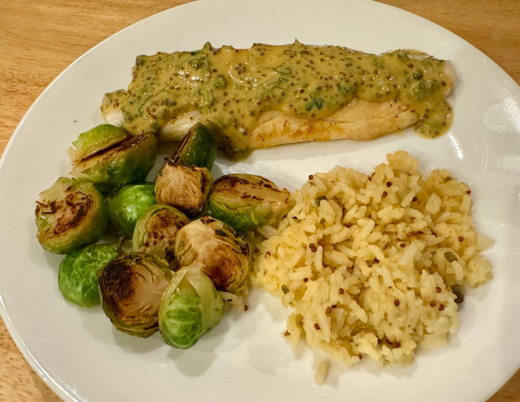 The fish cooked in 12 minutes in which time the Brussels sprouts were done and I had reheated the rice. We served the fish and rice with some of the mustard sauce and enjoyed the incredibly delicious Brussels spouts on their own.